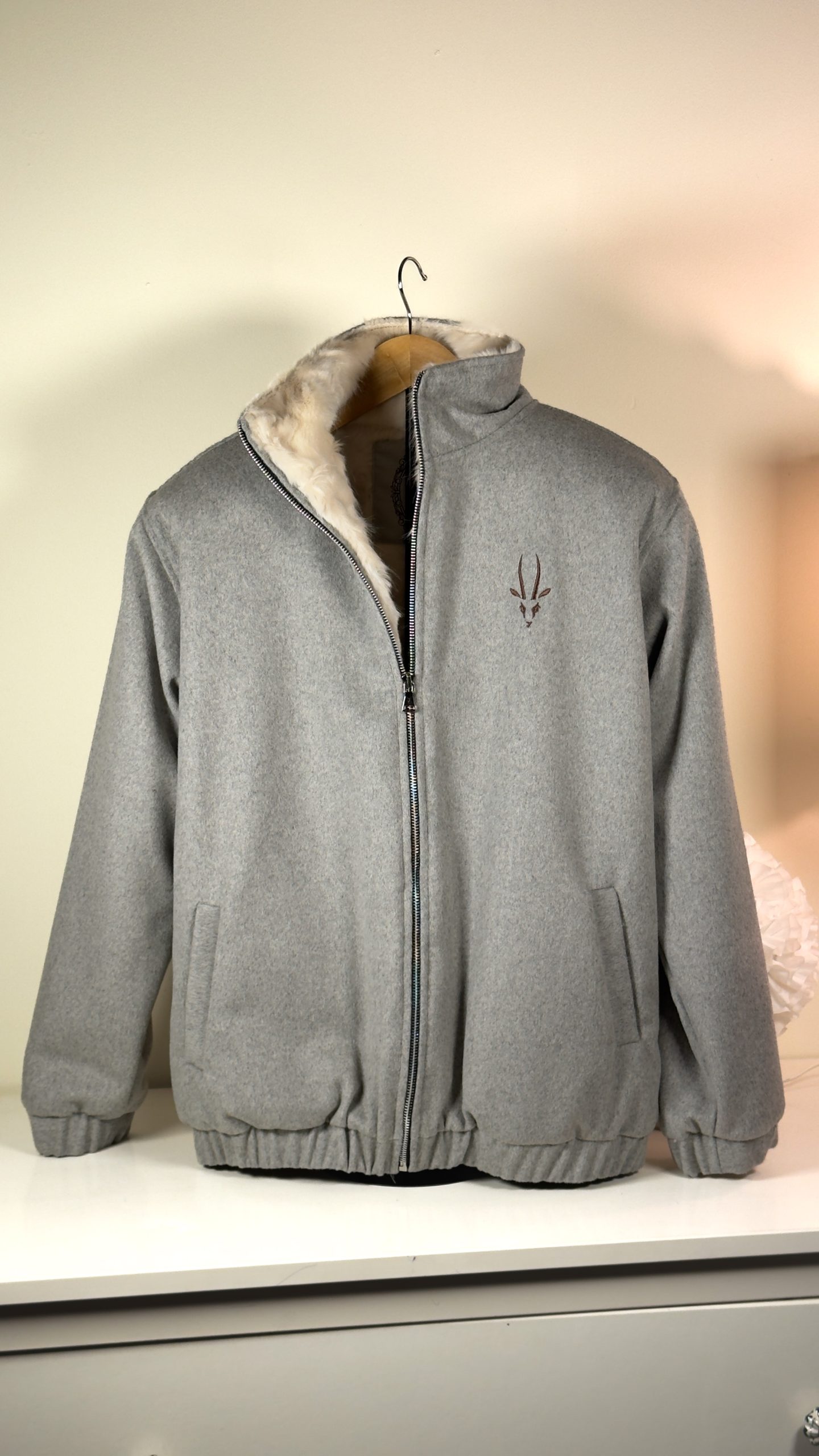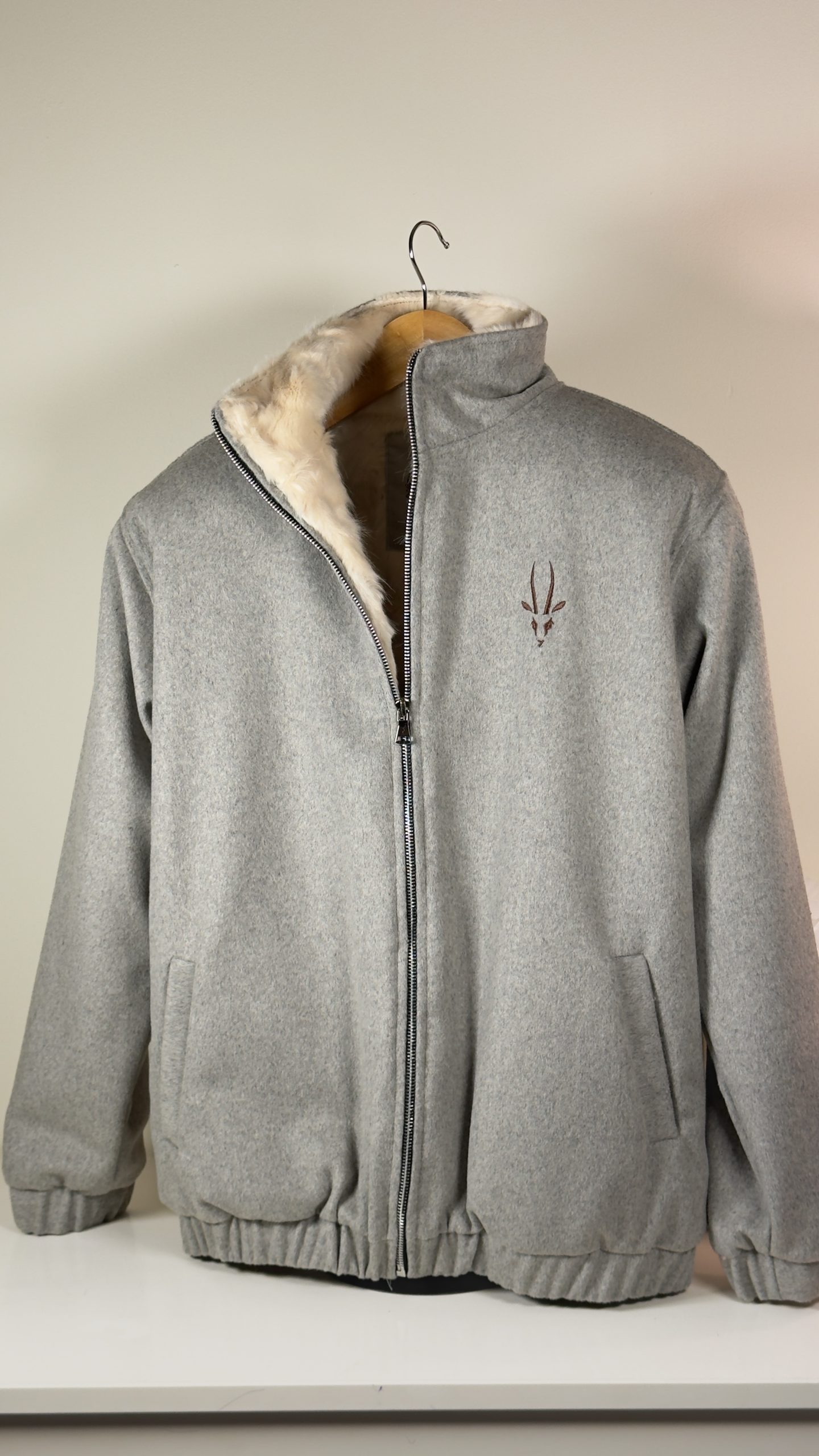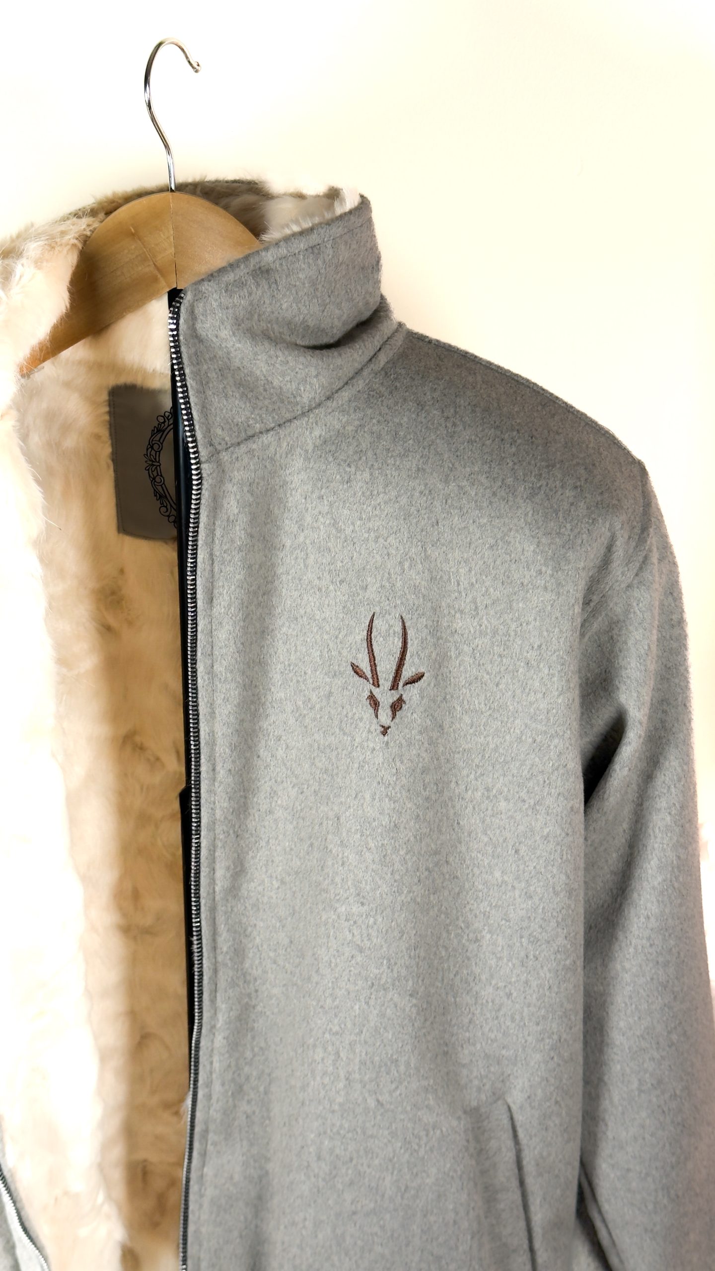 Light gray wool zip-up jacket with soft fur lining
